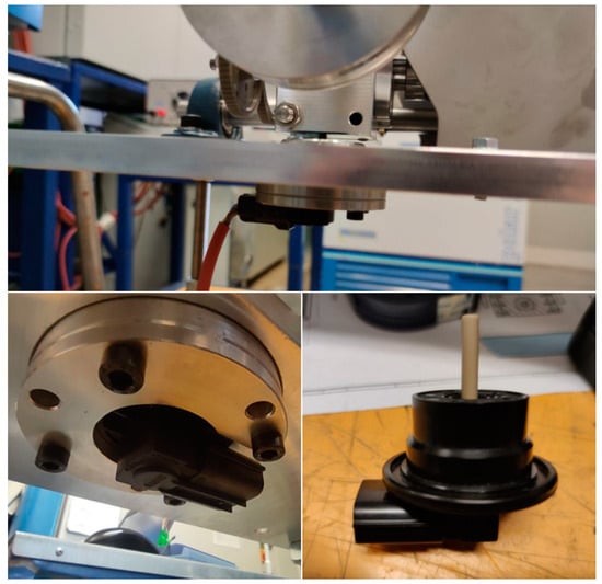 For the lowering of the gearbox due to the wear of the teeth of the gears under test, a resistive position sensor was employed (Figure 9). The chosen transducer is directly manufactured by the EU company and is usually used in turbochargers, with very high reliability. The transducer is positioned approximately 130 mm from the pivot axis. By recording the vertical displacement, it is possible to calculate the rotation angle γ of the block and subsequently, it can be integrated into equations for monitoring the wear of the wheel as discussed in paragraph 2. Heat-resistant materials are used for all of the parts and cables necessary for the sensor system.