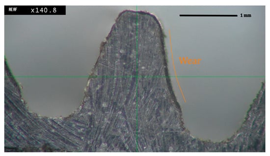 The preliminary test conducted showed us good agreement between the wear calculated through Equation (4) and the wear retrieved by post-processing of images or by a coordinate-measuring machine equipped with a micro metrology probe.