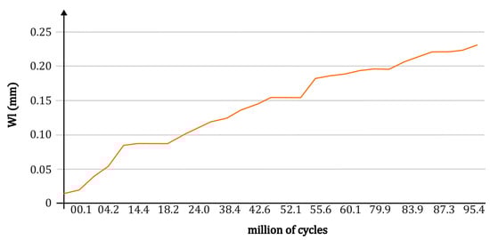 Wear on the right flank after a few million cycles is visible. The efficiency of the transmission was still good at the end of the test, showing the efficiency of the bench. In Figure 11, the graph shows the wear data retrieved with post-processing from Equation (4) as a function of the cycles completed. For this, a correction factor of 7/6 was applied to the equation, considering that only of the gears (nominal thickness ) was in contact during the test. Two identical plastic gears of module , primitive diameter (see 9 in Figure 2), number of teeth , with inclination , at and constant torque of were tested.