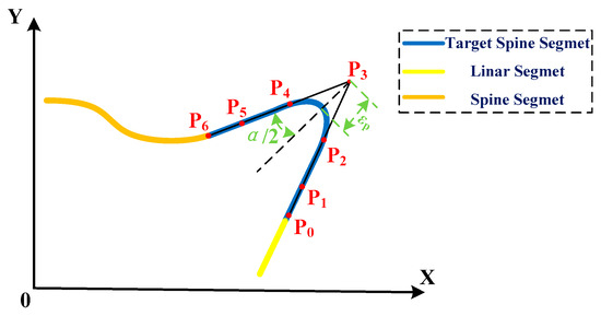 where ax∈[0, δl] is the intermediate angle between the vector OO0 and OO4, lx ∈[0, 2.5l] is the intermediate distance in P0P3. Since the fitting spline is a symmetrical curve, the intermediate angle between the vectors OO4 and OO8, and the intermediate position in the P3P6, can also be expressed as Equation (13).