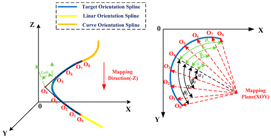 As shown in Figure 2, nine control points Oi = [O0, O1, ……O8] are inserted to fit the orientation spline. Since the orientation spline is located in a 3D space, the linear relationship among control points cannot be easily obtained. Hence, the tangential vectors at each control point are mapped to the XOY plane, where a fan-shaped plane is obtained and the angle among tangential vectors is θl, γl, βl, αl, θr, γr, βr, and αr. Note that O0 and O8 are regarded as the starting point (us = 0) and endpoint (ue = 1), and O4 is located at the highest curvature of arc O0O8. Similarly, the vector OO4 divides the fan-shaped plane into two equal sections, where θ1 = θr, γl = γr, and so on.