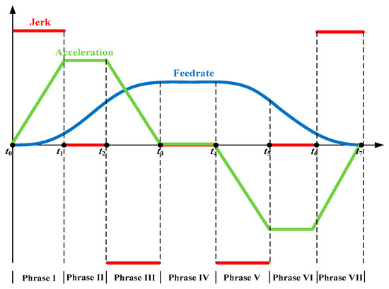 During the machining process, the dynamic characteristics of the tool have a great impact on the machining efficiency and accuracy [30]. To reduce the tool vibration, an S-type feed-rate profile is introduced to implement the interpolation. As shown in Figure 3, the feed-rate profile consists of seven phases (i.e., Phase I–VII), where I to III is the acceleration phase, IV is the constant-speed phase, and V–VII is the deceleration phase that is symmetrical with the acceleration phase.