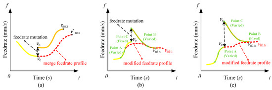 As shown in Figure 6, when it comes to vs > ve, the joint strategy is used to take Segment 2 and Segment 3 as one segment to modify the feed-rate profile. In Figure 6a, where ve < vs < vmax, set vs as ve and then modify the maximum feed rate of Segment 3 with the help of the S-type interpolation strategy to smooth local segments. If vmin < ve < vs, shown in Figure 6b, Point A in the interval [us2, ue2] in Segment 2 of the fitting curve and Point B in the interval [us3, ue3] in Segment 3 of the fitting curve are selected. The segment from Point A to Point B is the joint segment that smooths Segment 2 and Segment 3. Note that the distance d from interaction point C to the joint segment should be within the maximum chord error εmax to avoid overcutting and undercutting, which means d ≤ εmax, as shown in Equation (28).