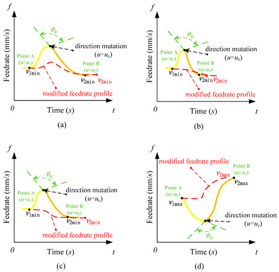 As θp affects the machining efficiency, θp is determined as 135°. When v1min > v2min, shown in Figure 7a, Point A (u = u1) and Point B (u = u2) can be taken as the starting point and endpoint of the joint segment to conduct the S-type feed-rate strategy. If the approximate length ls(ab) meets the condition, ls(ab) ≥ Sacc(ab) + Sdec(ab), the joint segment AB can realize the S-type feed-rate profile as a new segment. If Sacc ≤ ls(ab) ≤ Sacc(ab) + Sdec(ab), shown in Figure 7b, only the deceleration phase in the S-type feed-rate profile is conducted. When it comes to (v12max − v22max)/2amax ≤ ls(ab) ≤ Sacc(ab), shown in Figure 7c, the feed rate first slows down to v2max and then moves at this constant feed rate to Point B. Otherwise, the current basic unit is marked as an undetermined basic unit. Similarly, when v1min < v2min, converting the deceleration phase into the acceleration phase can solve the problem. When it comes to v1max < v2max, shown in Figure 7d, the interpolation cannot directly accelerate to v2max due to the feed-rate limitation. Hence, the interpolation in the interval [u1, ue] will process at the constant feed-rate v1max and then accelerate to v2max. It should be guaranteed that the chord error εe at u = ue and v1e = v1max is less than the maximum chord error εmax, which means 4εmax·(2ρe − εmax)/(Ts·v1max)2 ≥ 1. Otherwise, the current basic unit is marked as an undetermined basic unit. Similarly, when v1max > v2max, converting the acceleration phase into the deceleration phase can solve the problem.