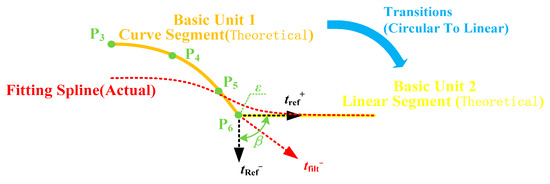 According to the fitting spline in Section 2.1, the basic interpolation unit consists of three segments, as shown in Figure 4. To better describe the interpolation unit, it is depicted with the upper and lower bound. Two curve segments, Segment 1 and Segment 2, represent the quintic splines from P3 to P6 and P0 to P3, respectively. As a linear segment, Segment 2 serves to connect the two curve segments, ensuring a smooth transition between them.