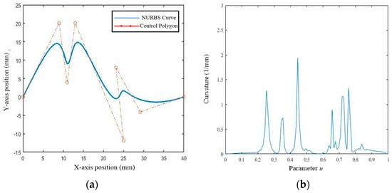 The Tree-shaped NURBS Curve. (a) Tree-Shaped NURBS Curve; (b) curvature of the Tree-Shaped NURBS Curve.