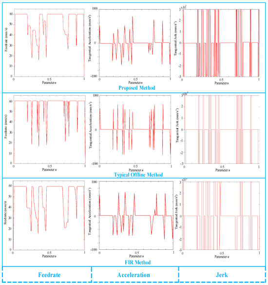 The results of the kinematic parameters of the X-axis and Y-axis are shown in Figure 22, Figure 23 and Figure 24. It can be seen that the feed-rate profiles of the three methods are all within the kinetic limitations. Note that, in the initial stages of the processing, Area A, there exist contiguous shorter higher-curvature segments, and the proposed method obtains a smoother feed-rate profile. However, the jerk profile of the typical offline method and the FIR method in this area exceed the limitation because the acceleration rate varies significantly, and frequent changes occur in the feed rate. For Areas B and C, where more short-curve segments exist, there is no solution for local offline feed-rate scheduling proposed in this paper, and parts of prediction error e(t) in the real-time interpolation have exceeded the MAE. Hence, the proposed method activates the global online feed-rate scheduling to obtain a better jerk profile compared with the FIR method. Furthermore, the processing efficiency is also guaranteed due to the FIR login and logout condition. As multiple optimization problems cannot be solved in the typical offline method, it is necessary to obtain a high and instant acceleration, which causes the jerk profile to exceed the limitation. For Area D, since the processing efficiency is the highest priority of the typical offline method, large values of acceleration and deceleration are required to achieve the predefined feed rate at the end of the segments, and the jerk profiles are beyond the limitation. Moreover, the deceleration point of the FIR method appears earlier than other methods, which requires a greater jerk to pass through the end of segments. Thus, the jerk profile of the FIR method is also beyond the limitation. Compared with the FIR method and the typical offline method, the proposed method obtains a better result to realize the kinetic constraints.