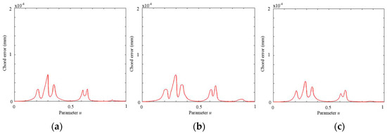 Assume that the linear length between the control points P2 and P3 is l. Similarly, the length between P3 and P4 is also l due to the symmetry of the fitting spline. Submitting the liner length l into Equation (6), the linear length P0P1 is 0.5l, P1P2 is l, P6P5 is 0.5l, and P5P4 is l. Note that the linear length l is variable, respected with the chord error εp which occurs between control point P3 and u=0.5 of the fitting spline. As shown in Figure 1, the chord error εp can be expressed as: