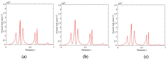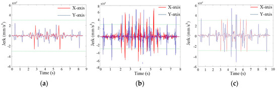 Jerk results of butterfly-shaped NURBS curve. (a) Proposed method; (b) typical offline method; (c) FIR method.
