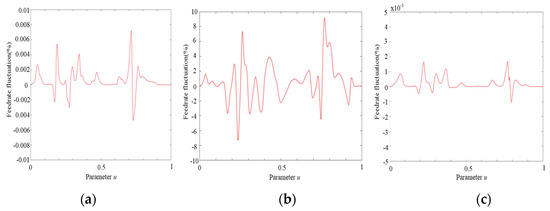 Feed-rate fluctuation of WM-shaped NURBS curve. (a) Proposed method; (b) typical offline method; (c) FIR method.