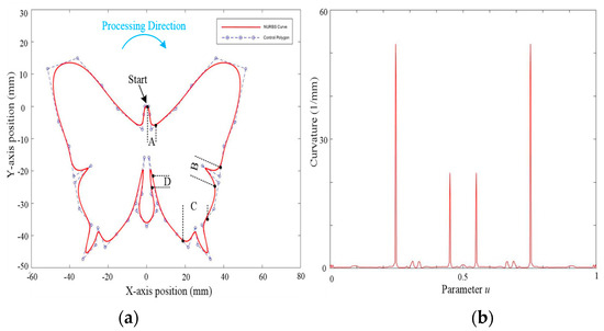 The selected NURBS curve is shown in Figure 21a, and the curvature is shown in Figure 21b. The curve parameters are shown in Appendix A, and the processing parameters are shown in Table 3. Note that the selected NURBS curve is complex and that there exists a large number of instantaneous acceleration and deceleration segments. Therefore, to minimize the impact of processing vibrations and the frequent acceleration and deceleration of the experimental results [22], the dwell time Td is set to 255 ms, and the time constants of two filters are set to T1 = 175 ms and T2 = 80 ms. Also, the fundamental frequency wc is set to 50 Hz.
