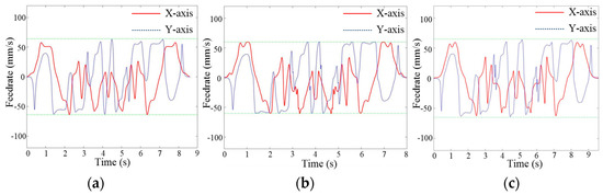 Feed-rate results of butterfly-shaped NURBS curve. (a) Proposed method; (b) typical offline method; (c) FIR method.