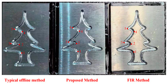 From the machining experiment of the tree-shaped NURBS curve, the contour errors of each point are listed in Table 5, and the comparison results of machining indicators are listed in Table 6. From Table 5, it can be seen that the contour error of each point of the proposed method is within the limitation. However, the contour errors of the offline method in Point 1 (0.0597 mm) and Point 4 (0.0661 mm) exceed the limitation of 0.05 mm. What is more, the contour error in Point 2 almost reaches the limitation. There are two points (0.0593 mm in Point 3 and 0.0588 mm in Point 4) that exceed the limitation in the FIR method. From Table 6, the offline method performs best with a response time of 65 us, a CPU occupancy rate of 14%, and a machining time of 375 s because the interpolator only needs to call the offline data without the online calculations. Although the proposed method performs worse than the offline method, it ensures the machining quality with the least average contour error of 0.029 mm. Note that the FIR method still performs worst in machining indicators with a machining time of 465 s, a response time of 289 us, and a CPU occupancy rate of 25%.