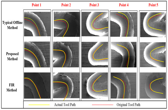 The comparison results are shown in Figure 28. It can be seen that, at Point 1, the proposed method achieves a small contour error and performs best relative to the other two methods. For a continuous high-curve transition between Point 2 and Point 3, the feed-rate profile is optimized by the offline local smooth strategy in the proposed method. Thus, a longer deceleration distance is obtained, which further reduces the feed rate to let the interpolation pass through the endpoint at a constant low-feed rate. However, there are frequent accelerations and decelerations in the other two methods, which result in large contour errors. At Point 4, no optimal solution can be obtained by the offline local smooth strategy. Hence, Point 4 is marked as an undetermined segment by the proposed method. When the interpolation processes at this segment, the global online smoothing strategy activates, which makes the actual position similar to the FIR strategy. Since the FIR login and logout conditions are introduced in this paper, the contour errors are slightly different at the highest curvature point, whereas the FIR method has a larger contour error due to the premature appearance of the deceleration point. For the typical offline method, the contour error is large because frequent acceleration and deceleration are required. Similarly, for Point 5, the proposed method has a better performance than the other two methods.
