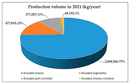 Figure 1 graphically shows the production volumes that were produced in 2021 on the original production line and their percentage in relation to the total production of these products. The figure shows that the largest share of production is in the production of breaded cheeses, with 75%. Because of the highest production share, breaded cheese was chosen as the representative sample on which all calculations are calculated. Specifically, 100 g of breaded cheese with a rectangular shape.
