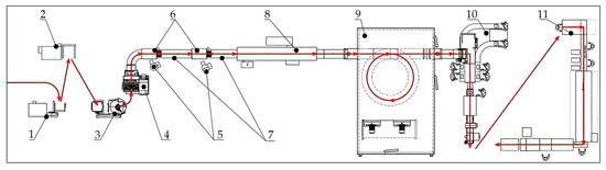 The production flow of the breaded foodstuffs on the original production line is shown in Figure 4. A description of the numbers of all production equipment is given in Table 3.