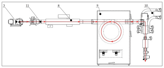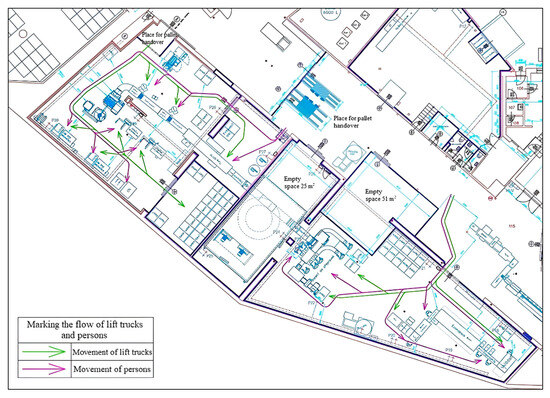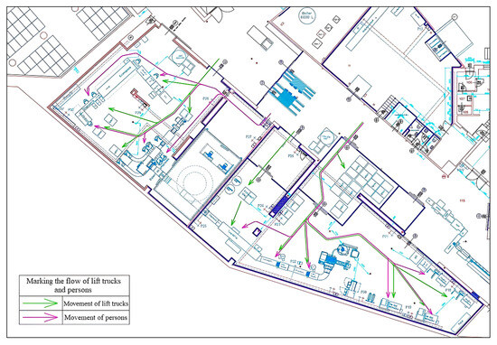 A graphical tool—Sankey diagram—was used to illustrate all material flows in the company. To draw the diagram, a production layout is needed, into which the diagram is drawn. Sankey diagrams are used to visualize the flow of materials in different networks and processes, and it is one of the most used tools [19,20]. It is possible to express the progress of a single material or a whole group of materials in a diagram. The width of the lines represents the volume of material handled per unit time, and the length of the line represents the transport distance. The arrow indicates the direction of the material being transported [13].