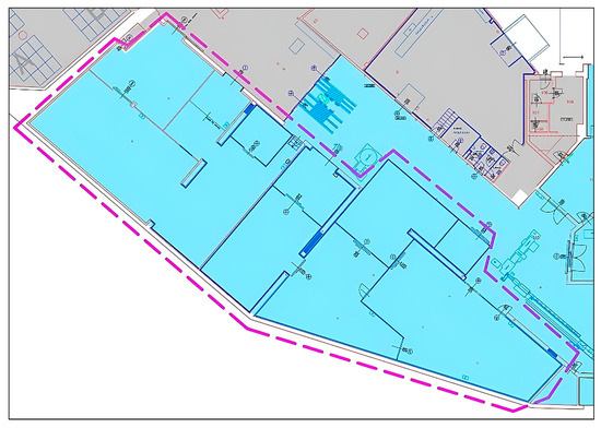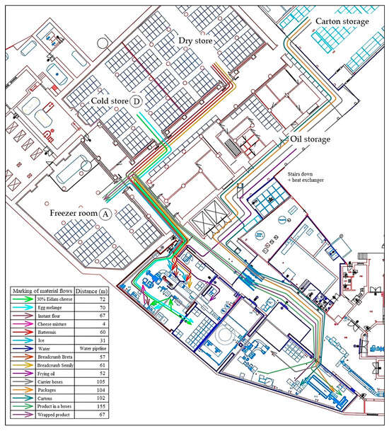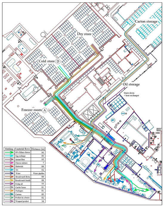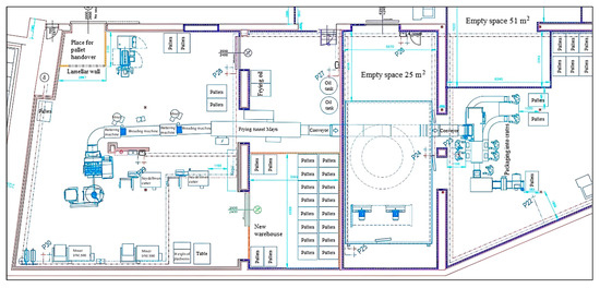 The capacity of the new production line will be set at 1500 kg/h, i.e., 15,000 pcs/h (for 100 g cheese), which corresponds to the maximum capacity of the existing frying tunnel. Based on a consultation with the company’s management, a space has been identified to locate the new production line on the ground floor of the ready-made foods production area, which is close to the warehouse. These areas are delineated by the purple dashed line in Figure 6.