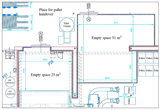 A relatively important advantage of Option 2 is the saving of 25 m2 and 51 m2 of space that can be used for setting up other production machines. The empty spaces are shown in Figure 17.