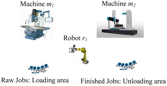 In order to demonstrate the modeling of TPNs, consider an FMS, presented in Figure 3, that is composed of two machines m = 1, 2, operating two different jobs i = 1, 2, in a sequential manner; one robot, r1 (material-handling equipment); and a load/unload station.