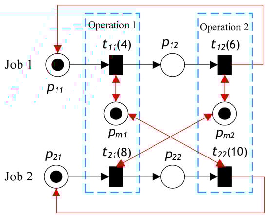 In many cases, some operations in a job are not linked by precedence. This can be modeled in TPN by utilizing the synchronization and mutual exclusion properties of PN, as shown in Figure 10. In this case, the machine can start processing the selected operation without precedence restriction, but both operations will be processed in a certain sequence because the job entity is considered a shared job.