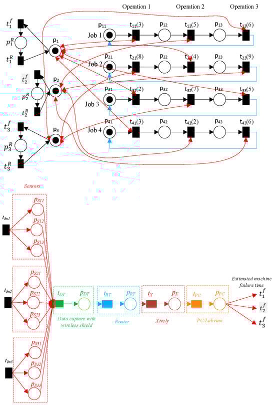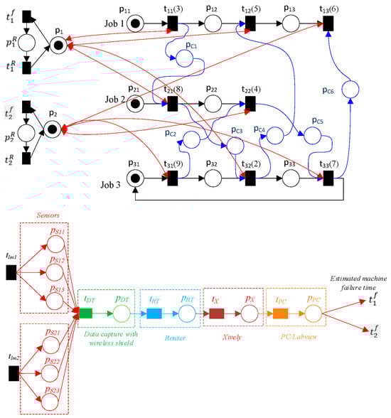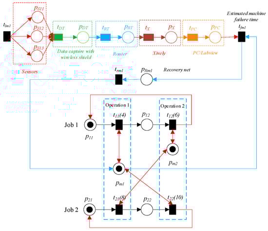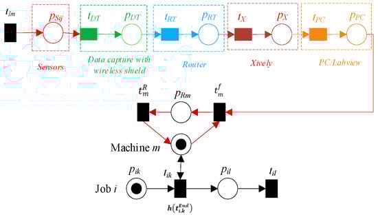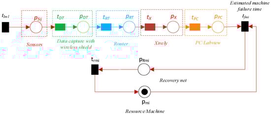 Consider a TPN denoted by N, where N is defined as N = (P, T, F, W, h(T), Mo). Let NIoT be an estimation resource of the pi failure time and recovery net based on IoT, denoted as NIoT = ({pmi, pSij, pDT, pRT, pX, pPC, pRmi}, {tImi, tfmi, ttmi, tDT, tRT, tX, tPC}, FIoT), where MIoTo indicates the initial markings of NIoT, MIoTo(pi) ≥ 0. FIoT = {(tImi, pSij), (pSij, tDT), (tDT, pDT), (pDT, tRT), (tRT, pRT), (pRT, tX), (tX, pX), (pX, tPC), (tPC, pPC), (pPC, tfmi), (pmi, tfmi), (tfmi, pRmi), (pRmi, trmi), (trmi, pmi)}, where pSij represents the sensor’s system for resource pi failure sensing, pDT indicates the “data capture with wireless shield”, and pRT denotes the router. The data collected by the pSij sensors are transmitted to the Internet, specifically to the servers of Xively (expressed as pX), which is a platform specifically developed for the IoT. The data that have been gathered can be accessed and observed through the PC-LabVIEW program, which is denoted as pPC. The transitions tImi, tfmi, trmi, tDT, tRT, tX, and tPC represent various types of transitions within the system. Specifically, these transitions correspond to the resource input sensors data pmi, the resource failure time pmi, the resource recovery of the resource pmi, the data capture, the router, the Xively, and the PC/lab view, respectively. An unreliable net is formed when the TPN (N, Mo) is joined with the estimating resource failure net (NIoT, MIoTo), as shown in Figure 6. This combination is denoted by the formula (NS, MSo) = (NIoT, MIoTo) ‖ (N, Mo), where ‖ indicates the combination of (NIoT, MIoTo) and (N, Mo).