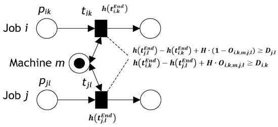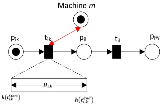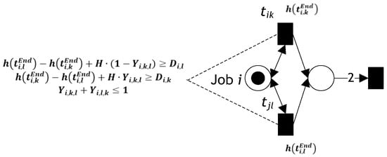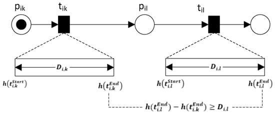 Figure 9 illustrates the sequence of operations when operation k precedes operation l for job i. The processing time of the first operation (k) is included in the firing time of the end transition . If there are two operations in series, as shown in Figure 8, then the time interval between the firing completion of both the end transitions and must be equal to or larger than the operation time of the second operation. By testing the condition ti,k• ∩ PA = •ti,l ∩ PA, the precedence relation can be obtained from the timed PN model shown in Figure 9, where ti,k• ∩ PA = •ti,l ∩ PA = pil. This constraint can be represented as follows: