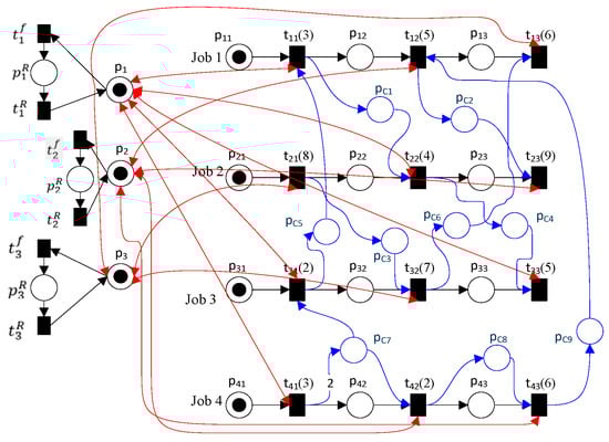 - Mejía, G.; Odrey, N.G. An approach using Petri nets and improved heuristic search for manufacturing system scheduling. J. Manuf. Syst. 2005, 24, 79–92. [Google Scholar] [CrossRef]