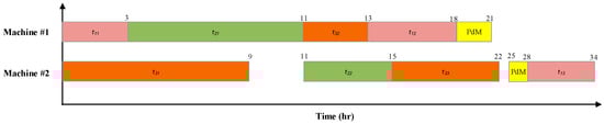 As shown in Figure 8, the completion time of the operation k for each job i depends on the processing time of operation k and the time to repair for corrective maintenance of the assigned machine m and can be formulated as follows: