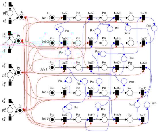 PN time constraints are typically related to places or transitions. In this study, TPNs are employed. The graphical models of TPNs are constructed from the logical sequence of the modeled system. Therefore, they are simple to build, extend, and apply to production system scheduling problems. In FMS, there are three major precedence relations for part processing: operations are processed in accordance with specific sequences, operations are processed in any sequence, or both relations are included in a part process plan. Synchronization and concurrency principles are essential to the study of FMS, and TPNs enable simple structures to describe these crucial concepts, as well as “conflicts”, “non-determinism”, “timing information”, and “resource sharing environment”. In this paper, the problem is FMS scheduling with PdM to minimize the total completion time.