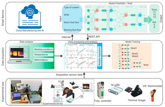 The paper focuses on a high-speed motorized spindle unit of grinding machine tools. Thermal equilibrium experiments were realized using an acquisition system to measure temperature and thermal deformations for different spindle speeds, coolant types (oil, water), and coolant flow of motor and bearings (working conditions). Choosing both coolant types enables a more thorough analysis of the algorithm’s performance and its sensitivity to variations in cooling conditions, contributing to a more profound understanding of its capabilities and limitations. We have assessed their effectiveness in cooling the system and determined which is more suitable for the specific application. The framework of the proposed model is shown in Figure 1. Upon gathering data, we analyzed the impact of various working conditions on spindle temperature and examined how these temperatures influence thermal deformation. Multiple Regressions (MRs) are used to establish the relationships between working conditions (input parameters) and temperatures (output parameters), as well as temperature variables (input parameters) and thermal deformations (output parameters). Working conditions were used as input parameters of the first ANN model (NNet1), while temperatures of the spindle unit were given as the output parameters. Subsequently, these temperatures are used as input parameters for the second ANN model (NNet2), employing thermal deformations on the spindle nose as output parameters. After successful separate training of NNet1 and NNet2 models, the models have been evaluated in sequence, i.e., normalized values of outputs obtained from NNet1 have been used as inputs to the previously trained NNet2 in the validation phase. Finally, comprehensive MIMO BP neural network (NNet) approaches were established for spindle temperature and thermal deformation. After the network learning and training, the temperatures and thermal deformation of the motorized spindle unit in multiple places have been accurately fitted and predicted. Furthermore, a system architecture involving cloud computing is developed. The models were migrated to a dedicated cloud solution developed for this purpose, wherein all calculations regarding predictions are conducted. This architecture relies on the REST API calls for uploading data and getting calculated predictions. Afterward, a new set of stochastic sample data is used to validate the model. The results indicate that the model exhibits a high level of prediction accuracy. This implies that an accurate model can be obtained, offering references for characteristic parameters related to thermal equilibrium.