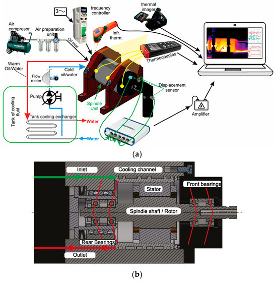 The high-speed motorized spindle is one of the core components that influence the machining precision and productivity of machine tools. The factors affecting the machine tools’ accuracy can be divided into four different categories, namely, geometric, kinematic, thermal, and cutting-force-induced errors. Elevated temperatures during machining with a high-speed spindle often result in thermal expansion. Variances in temperature-induced expansion and contraction rates between the spindle and workpiece can lead to deviations from the intended dimensions. On the other hand, rising temperatures may also cause thermal gradients in the spindle, leading to uneven thermal expansion. This can induce vibrations and deflections in the spindle structure, impacting machining accuracy. Thermal errors can appear from the heat generated during the machining process, leading to deformations and deviations in the spindle. A comprehensive examination of thermal error modeling techniques investigated and utilized over the last decade was provided in [1]. The motorized spindle itself can contribute to heat generation through energy losses, such as electrical losses in the motor and mechanical losses in the bearings. The material composition of the spindle affects its coefficient of thermal expansion. As the spindle heats up during machining, temperature distribution across the spindle will not be uniform as it expands. Certain areas may experience higher temperatures than others, leading to uneven thermal expansion, which may result in dimensional changes in the spindle components. Thermal growth on the spindle components produces thermal expansion of bearing elements, causing the so-called thermal preload. The temperature can have a significant influence on the preload in high-speed spindles, particularly in precision machining applications where tight tolerances are critical. Understanding the influence of temperature on preload is crucial for maintaining the performance and accuracy of high-speed spindles. Regular maintenance and monitoring of temperature conditions during operation are essential to ensure consistent performance over time. The percentage of thermal errors in total machine tool errors is between 40 and 80% [2,3]. On the other hand, bearing deformations account for 30 to 50% of total spindle deformations [4].