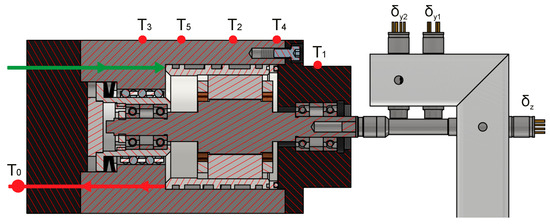 The measuring equipment is used to determine the temperature and thermal deformation. To measure the temperature of the spindle unit, K-type thermocouples with an accuracy of ±0.2 °C at 100 °C, and a thermal imager with an accuracy of ±1% have been used. An infrared thermometer with an accuracy of ±0.2% has been used to record the temperature at the outlet coolant from the spindle unit. Edge current sensors (HBM) were applied to measure the thermal deformation. The diameter of the sensor head was 3 mm, and the degree of nonlinearity was 0.1%. The system achieves real-time synchronous acquisition of the temperature and thermal deformation by utilizing an NI USB 6281 acquisition system. The installation locations of the sensors and thermocouples are shown in Figure 3 and Table 1.