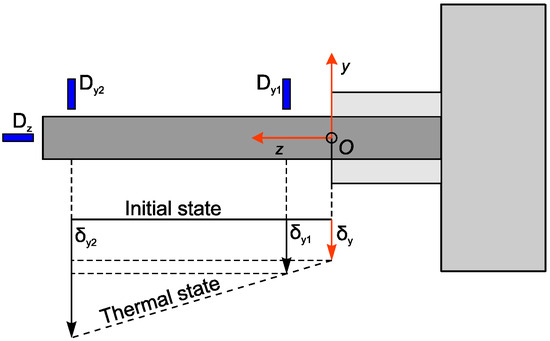 The spindle thermal deformation is measured by using eddy current displacement sensors. After the spindle reaches a steady state, the thermal deformation expands to the axial and radial direction, resulting from the uneven temperature gradient distribution, which is shown in Figure 4. Also, in Figure 4, a measurement diagram of the thermal deformation of the spindle inspection bar is presented. The spindle is oriented along the Z-axis, so the axial thermal expansion can be obtained by measurement via the sensor Dz. The radial deformation in the Y direction is measured by the sensors Dy1 and Dy2. Based on these detections, spindle thermal errors are calculated according to the presented geometry relationship as specified in [33].