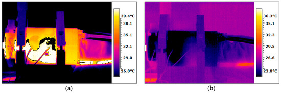 Temperatures of the spindle at n = 80,000 rpm; (a) cooling spindle stator with oil; (b) cooling spindle stator with water.