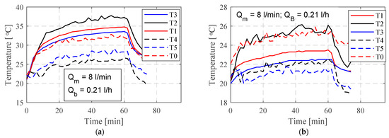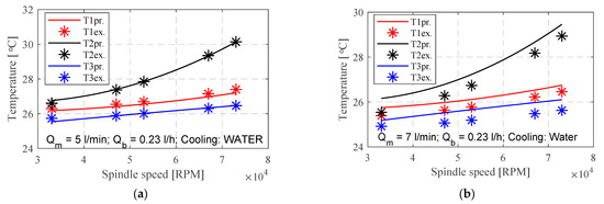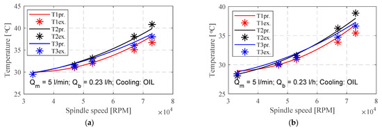 The results of temperature predicted by the model and the experimental data for cooling the spindle stator with oil: (a) Qm = 5 L/min; (b) Qm = 7 L/min.