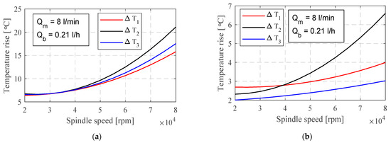 Based on these findings, insights into the historical temperature distribution of the motorized spindle unit can be gleaned, facilitating the selection of optimal coolant types and flow rates to mitigate temperature elevation and thermal expansion. The temperature results derived from the presented model enable the identification of optimal solutions and quantitative evaluation of enhancements in high-speed motorized spindle thermal characteristics. Selecting the suitable coolant and flow rate not only enhances the energy efficiency of the machine tool but also mitigates temperature fluctuations and errors stemming from heat load.