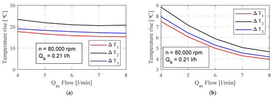 Change in temperature depending on the cooling flows of the stator with (a) oil, (b) water.