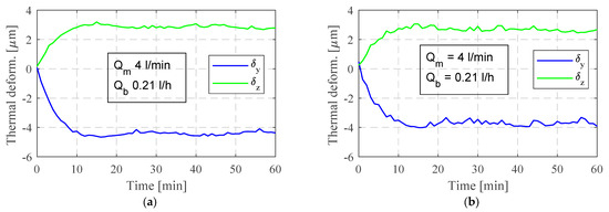 Thermal deformation of the spindle at n = 80,000 rpm; (a) cooling spindle stator with oil; (b) cooling spindle stator with water.