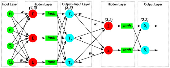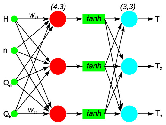 The first neural network (denoted as NNet1) (depicted in Figure 11) is designed to capture the relationship between the working conditions—specifically, the spindle speed n (given in revolution per minute—RPM), the coolant type H (represented in a binary form as 0 and 1 for oil and water, respectively), the coolant flow of the motor Qm [L/min], and the coolant flow of the bearings Qb [L/h], versus the output temperatures T1, T2 and T3 [°C], acquired through experimental testing. All input values have been normalized to the [0, 1] range. The network consists of one input (4,3) layer, one output (3,3) layer, and a hyperbolic tangent (tanh) layer between them (the numbers in brackets represent the number of inputs and the number of neurons, i.e., the outputs).
