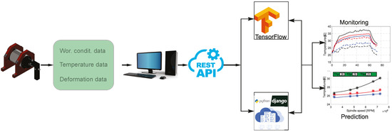 After the offline development of the model for predicting temperature and thermal deformations, the calculation of predictions was moved to a cloud computing system. For this purpose, a web application that is based on the Python Django web framework that implements desired model calculations is developed. REST API was used to upload input data and obtain model outputs in the response. The architecture of this part of the proposed solutions is given in Figure 15. The architecture ensures that predicting temperature and thermal deformations is not only locally available but can be used no matter where setup and equipment are mounted as far as the setup is connected to the internet. Connection between the cloud platform and the physical model is established through the PC that serves as a gateway. The gateway captures the real-time data of equipment workload, working conditions (spindle speeds, type of coolant (oil, water), and coolant flow of motor and bearings), spindle temperature, and thermal deformations from the physical equipment. The data are preprocessed and sent to the cloud platform where spindle temperature or deformation is predicted, which is later used on the gateway to adapt working conditions. The preprocessed data are encapsulated in a JavaScript Object Notation (JSON) format. Mainly, the gateway is used to acquire the working conditions data (spindle speeds, type of coolant (oil, water), and coolant flow of motor and bearings) and sensor data (spindle temperature and thermal deformations) of experimental equipment using different communication and acquisition interfaces (i.e., Modbus, OPC DA, and NI Acquisition Cards). The PC gateway then makes local analysis, preprocessing this data and formatting it into an adequate object that is sent to the cloud platform.