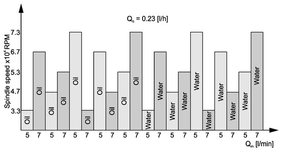 Oil and water were utilized for cooling the spindle stator. The tank was cooled through a heat exchanger, maintaining a constant temperature for the oil or water in the tank at 22 °C. The oil or water temperature at the exit of the stator cooling jacket ranged between 23 and 28 °C, depending on input parameters. Oil or water flows through the groove around the stator with a flow rate of Qm = 4–8 L/min. The system for measurement of fluid flow is composed of the Acrylic Flow Meters 6A01, measuring the amount of oil mist on the bearings at all times, and an Integral Flowmeter AXF, measuring the flow of the cooling fluid for the spindle stator.