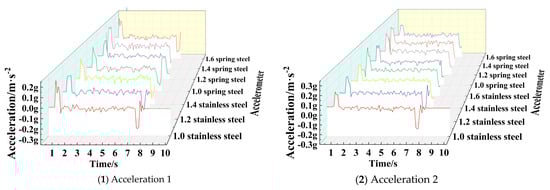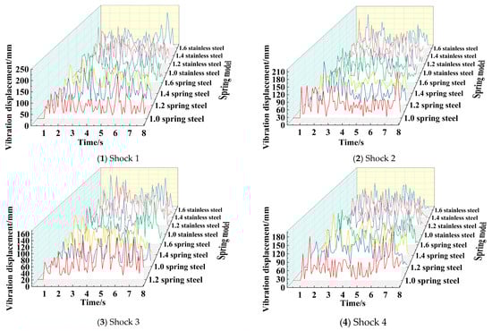 The spring suspension shock-absorbing structure adopts a spring with a wire diameter of 1.2 mm and made of spring steel material. The given chassis driving motor speed is 80 r/min, which is 0.52 m/s. The chassis test running distance is 4 m, and the operating environment is the porcelain floor. Under these conditions, the vibration displacement at eight different positions and the three-dimensional running acceleration curves at six different positions are obtained, as shown in Figure 12, Figure 13, Figure 14 and Figure 15.