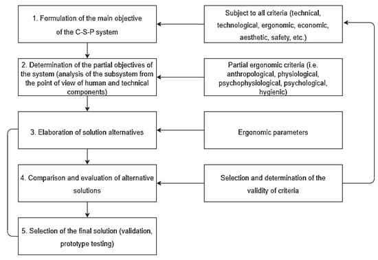The methodological procedure of the designer’s activity and the relation to ergonomic criteria and parameters are shown in the diagram in Figure 4.