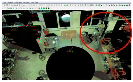 For fast and accurate import of objects, it is necessary to use progressive digitization methods. This part of the work is focused on creating digital images of selected structural elements in the working environment and objects in it using the digitalization method; the measuring stand for checking the pressure of the piston block is shown in Figure 5 on the right in the red circle. For the digitization of components, we cooperated with the Faculty of Electrical Engineering and Informatics of the Technical University of Kosice, LIRKIS Laboratory, and their 3D scanner Leica SCANSTATION 2, which is categorized as an active scanner with its own radiation source: laser.