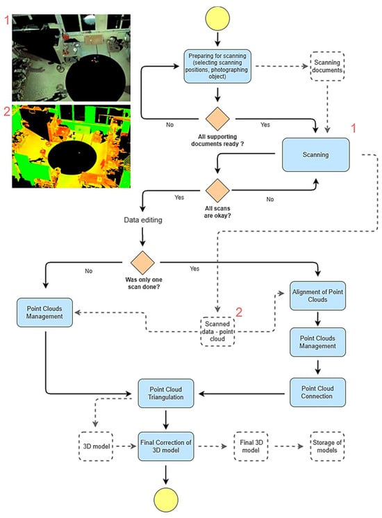 Using the LEICA SCANSTATION 2–3D scanner, a general algorithm for solving the 3D model and its creation procedure was developed based on the knowledge obtained after creating three-dimensional models of the maintenance workplace containing construction elements of aircraft structural nodes. The diagram in Figure 11 illustrates the general algorithm.