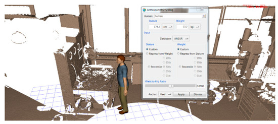The principal sequence of steps in the simplified process of digitizing a piston block maintenance workplace from a real work environment is through a scanned point cloud to a virtual 3D model of the workplace without texture. A 3D model of the worker is shown in Figure 6. Creating a 3D object is a process that involves more than just 3D scanning and data processing. Experience and practice with scanned data have shown that we do not modify the scanned polygon mesh with individual functions in the software due to the fact that it is quite a time-consuming process. We modify the scanned data directly in the Rapid form XOR software before importing and using the scan in the TX Jack working environment. In Rapid form XOR, the resulting deviation between the scanned part and the real model is determined.