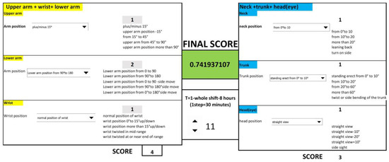 When evaluating ergonomics using the RULA method, a predetermined procedure is followed. In the first phase, the posture is evaluated in a package—neck, spine, and legs. For the evaluation, a table is created in which the values of the neck posture are recorded, and at the same time, the points express the intensity of the stress. The same procedure is followed for the spine and legs. By combining the tables created in this way, one resulting table will be created. The multi-criteria table created in this way is used to calculate the total value of posture stress. For better results, the resulting value of the product of individual results is multiplied by a relative constant whose maximum value is T = 1. This constant represents the value of a work shift (usually 8 h). The product of variables itself is a logarithmic product of variables. The RULA multi-criteria score table is provided in Table 2.