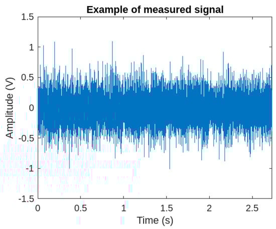 The tests carried out in the laboratory include different configurations (a bearing with inner-race defect, a bearing with outer-race defect, and a healthy bearing). Each type of defect was tested at 60 Hz. The type of the bearing was ER10K (Rexnord), and the characteristics are shown in Table 1. In this way, first, two healthy bearings were tested to have a healthy reference condition and in order to compare it with the defective condition. Afterwards, the bearing closest to the motor was replaced with a defective bearing in the inner race and the test was repeated. Finally, the same procedure was performed but for a defective bearing on the outer race. Regarding data acquisition, a sampling frequency of 6000 Hz was used. An example of a measured signal (outer-race defect) is represented in Figure 3.