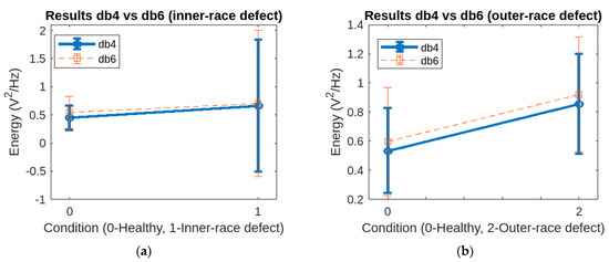To show the importance of good selection, results using the selected mother wavelet (Daubechies 4) will be compared with Daubechies 6, which has been commonly used in previous works. In Figure 6a, the mean energy and standard deviation values of the packet corresponding to the fault frequency of an inner-race defect are shown. In Figure 6b, the same results are shown for an outer-race defect.